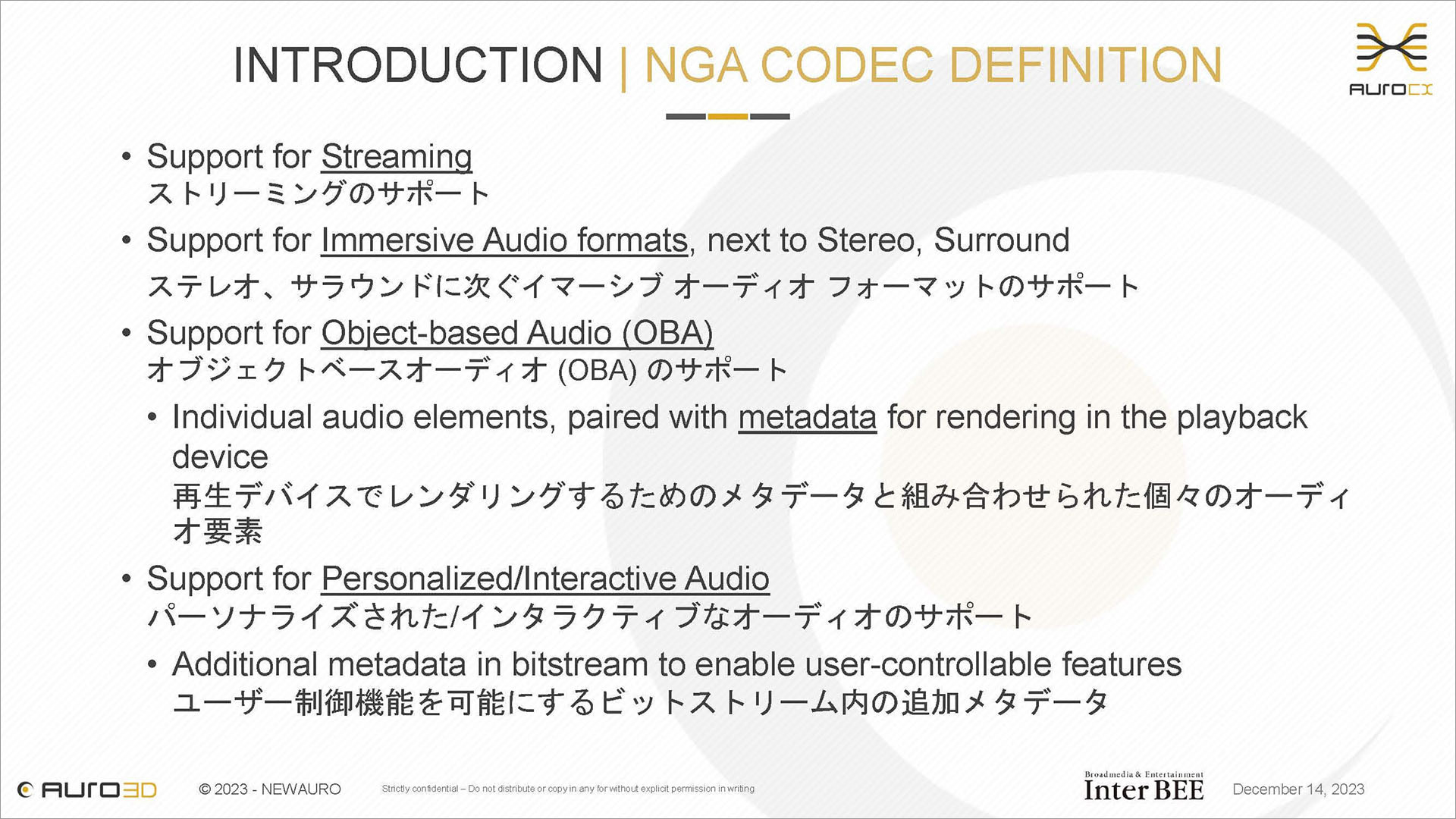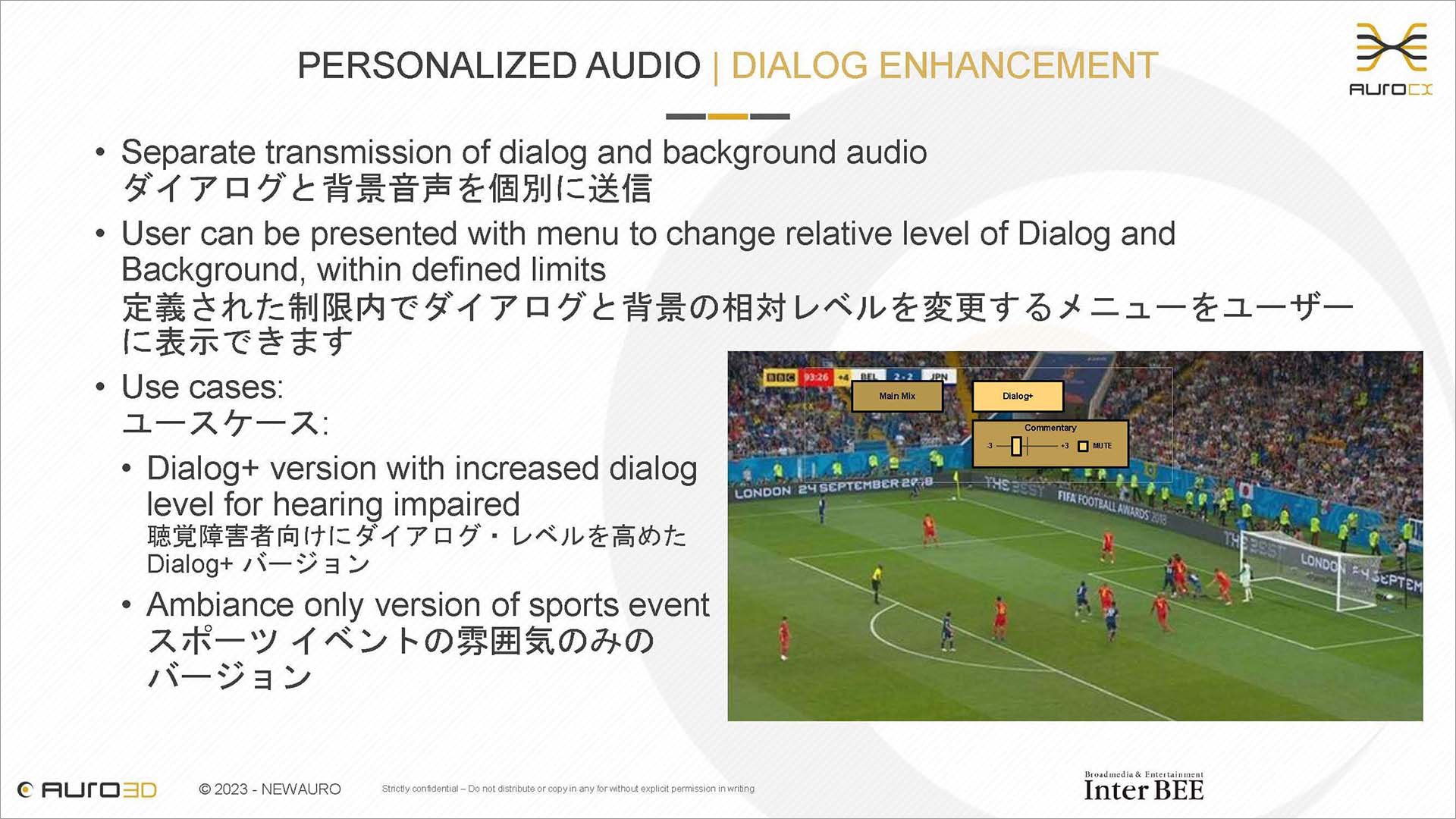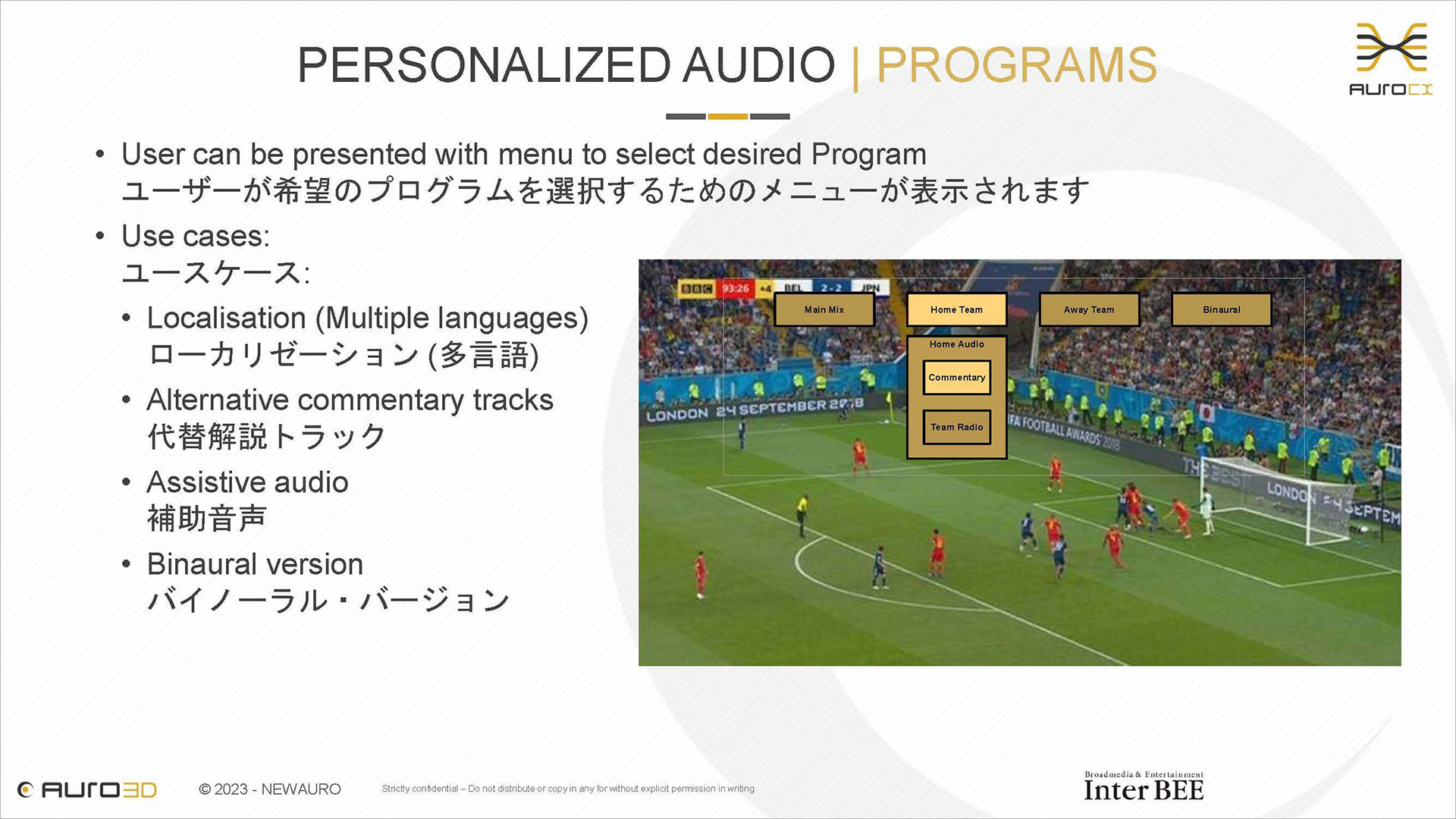 また、パーソナライズド・オーディオという機能もあり、例えばスポーツ中継などで、解説音声と会場の背景音を個別のオブジェクトとして送信できるため、解説音声の言語を選択したり、解説音声を無しにしたり、あるいは解説音声の音量や聞こえる位置を自由に調整することなどができます。このパーソナライズド・オーディオに関しては、実際のデモでスポーツ中継のサウンドを体験できました。解説音声と環境音が自在に調整できるのは、コンテンツを視聴する環境や楽しみ方に合わせられるので、とても良い機能だと感じました。