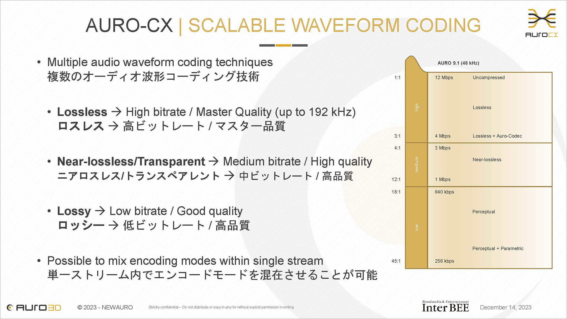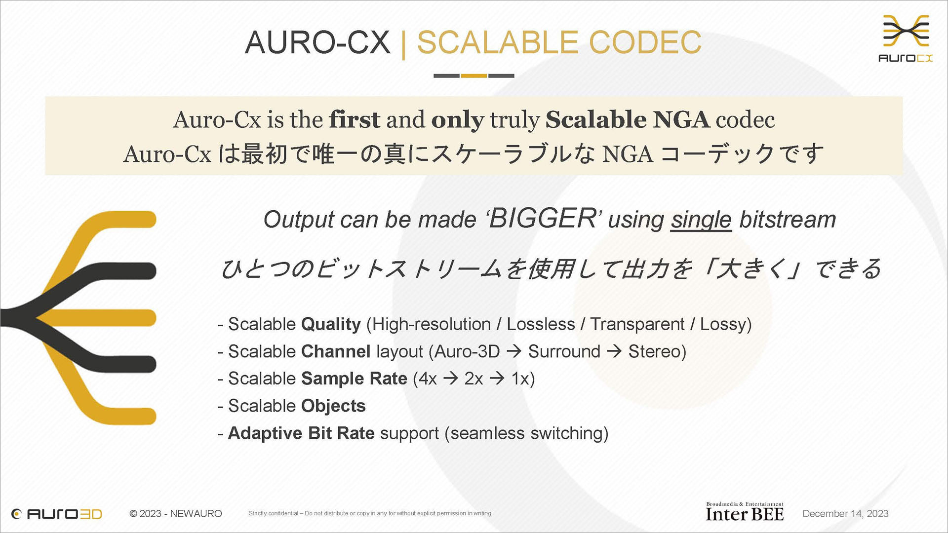 ここからはセミナーの本題である次世代コーデックのAuro-Cxについて。Auro-Cxの特性はスケーラブルなNGA(次世代オーディオ)コーデックであるとのこと。複数の音質やサンプリング周波数を、ひとつのビットストリームに同居させて送っていることが大きな特徴です。同時にAdaptive Bit Rate(ABR)をサポートし、同じコンテンツでありながらも回線のビットレートに合わせて変化します。例えば12Mbpsの回線速度があれば最高品質(192kHz)、4Mbpsならロスレス+Auro-Codec、3Mbpsならニア・ロスレスといったように回線速度の状況によってオーディオのクオリティがシームレスに変化します。これはオーディオ品質だけでなく、チャンネル・レイアウトやサンプルレートにも関係します。単一のストリーム内に複数の出力フォーマットがあるため、デコーダーは能力に応じて必要なものだけを抽出します。ステレオ・デコーダーならL/Rのチャンネル、5.1 decorderなら6ch、High-end Decorderなら22.2chに対応します。サンプルレートも48kHzから96kHz、192kHzがあります。