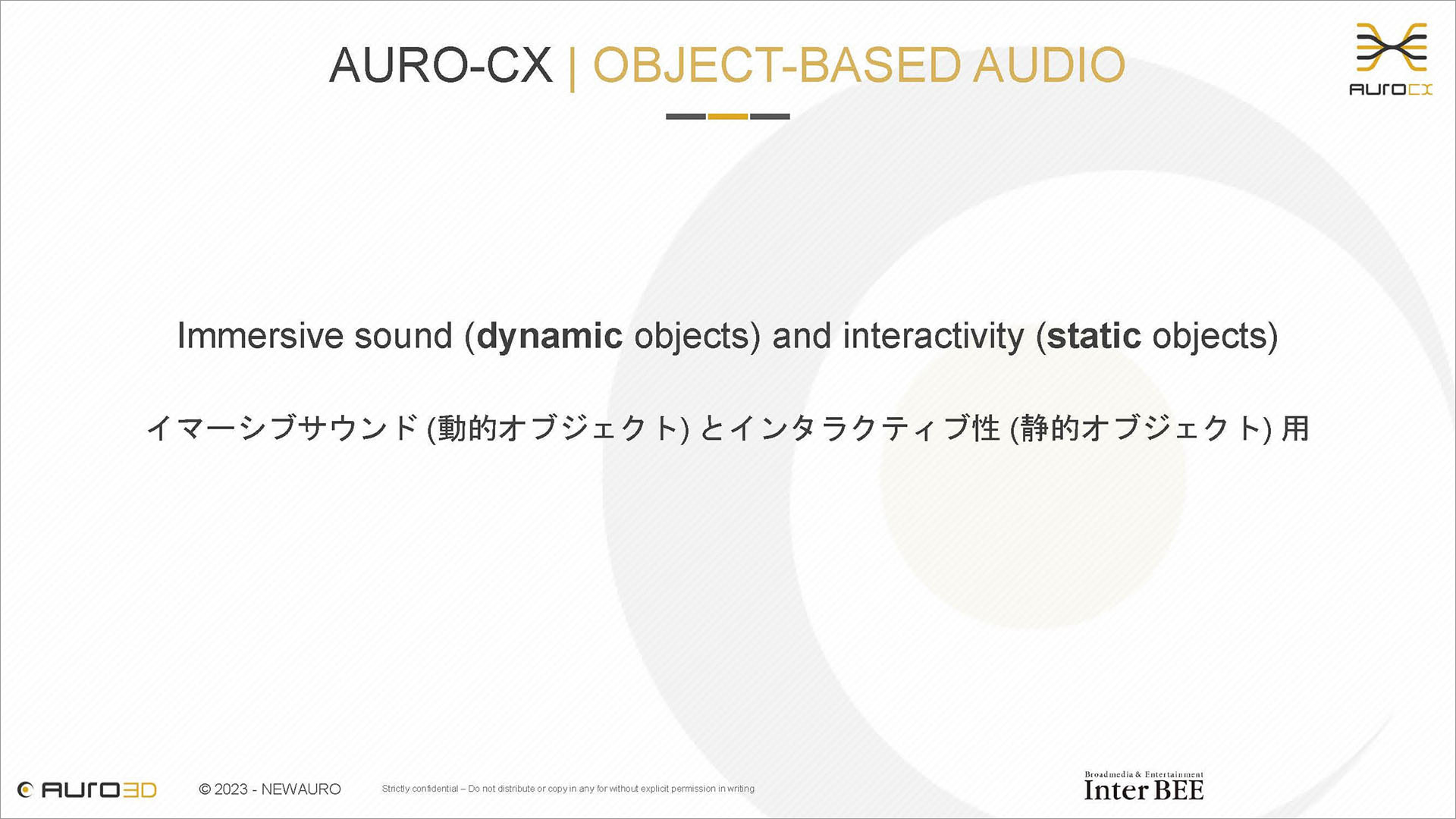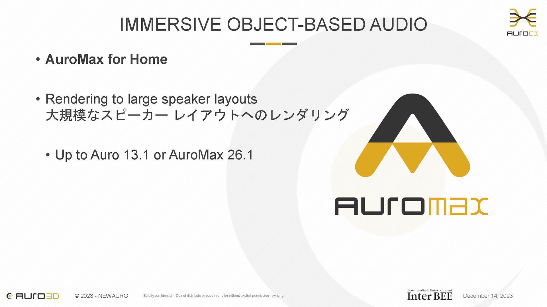 音質面以外の特徴として、Auro-Cxはイマーシブ・オーディオ・フォーマットに加えてオブジェクトベース・オーディオもサポートしています。これによっていわゆるコンサートのリアルな臨場感はもちろん、映画音楽などの動的なイマーシブ・サウンドにも対応します。これは先述したAuroMaxのように、シアターの大規模なスピーカーレイアウトからホームシアターまで、インターネットによるストリーミング伝送&レンダリングが可能となります。