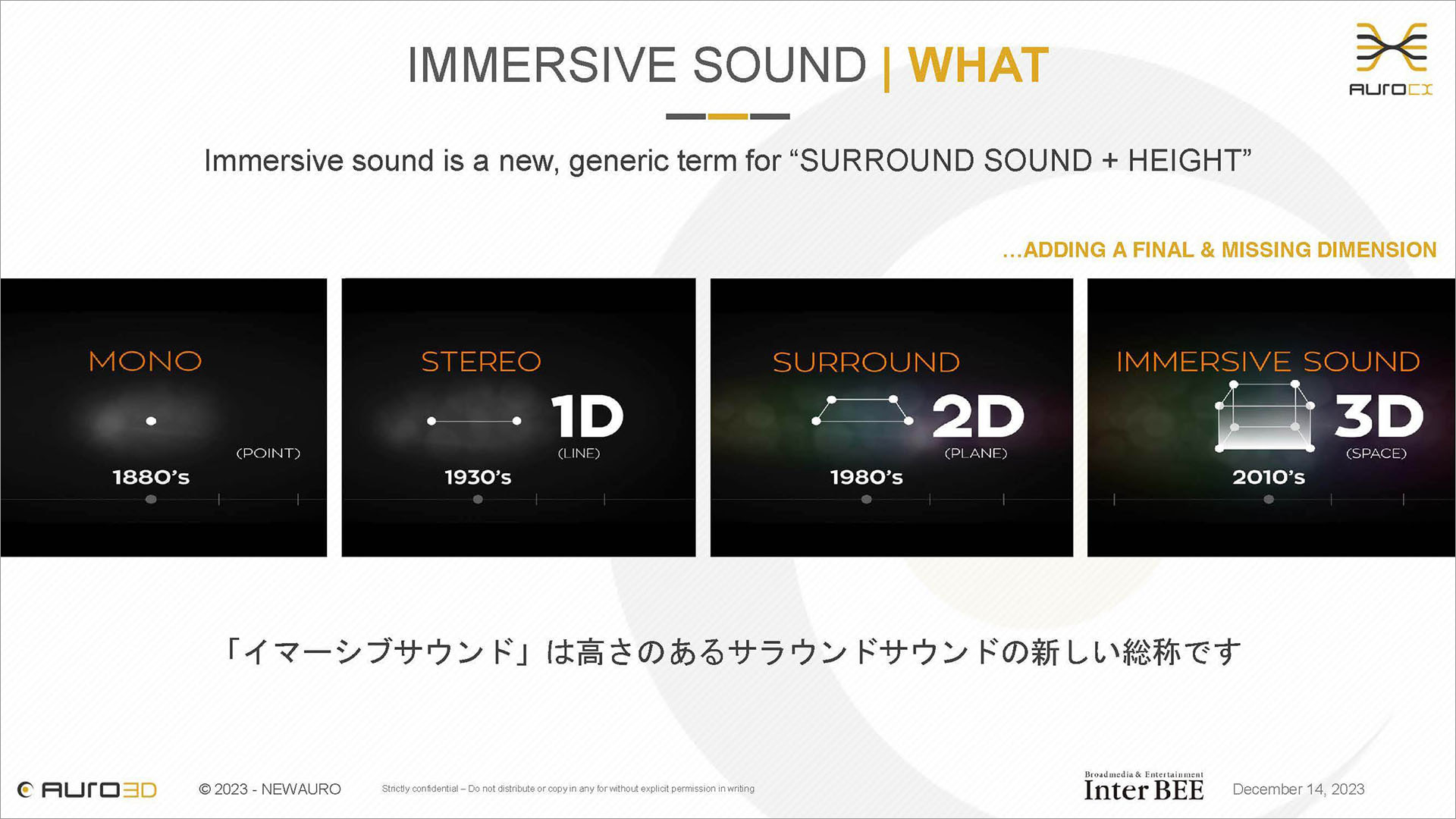 まずはAURO-3Dの概要についてベルト・ヴァン・ダーレ氏の解説をもとに説明をしていきます。一般的にはDolby Atmosなどの登場で広く認知されていったイマーシブ・サウンドという言葉は、もともとAURO-3Dが提唱したもので、高さを持ったサラウンド・サウンドの総称です。