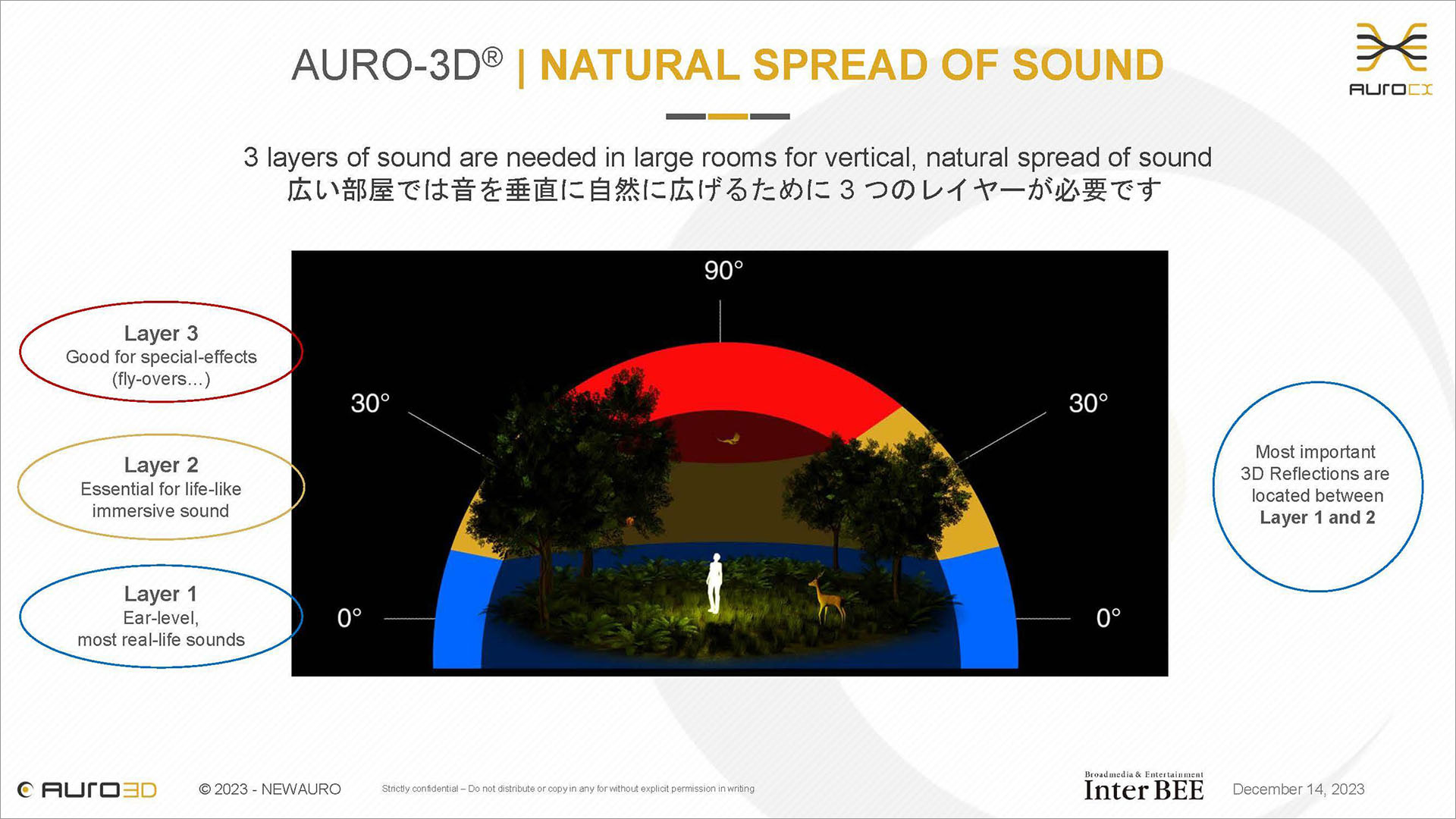AURO-3Dが2010年に実用化したイマーシブ・サウンドはナチュラルなサウンドを目指して、高さ方向の次元を用いた表現をしているのが特徴です。このナチュラルな広がりを持ったサウンドを表現するために“3つのレイヤー”が必要で、レイヤー1(イヤー・レベル・レイヤー)は人の耳の高さで実際に聞こえるリアルな生活音など、レイヤー2(ハイトレイヤー)はよりナチュラルに聞こえるためにリアリティを持った音、例えば外であれば木々の葉の音、部屋ならルームトーンなどの反射音。図で見るところの30°方向のサウンドは、AURO-3Dが提唱するナチュラルなサウンド表現において重要だと考えられています。また、レイヤー3(トップレイヤー)は例えば飛行音などのエフェクトなどが挙げられます。