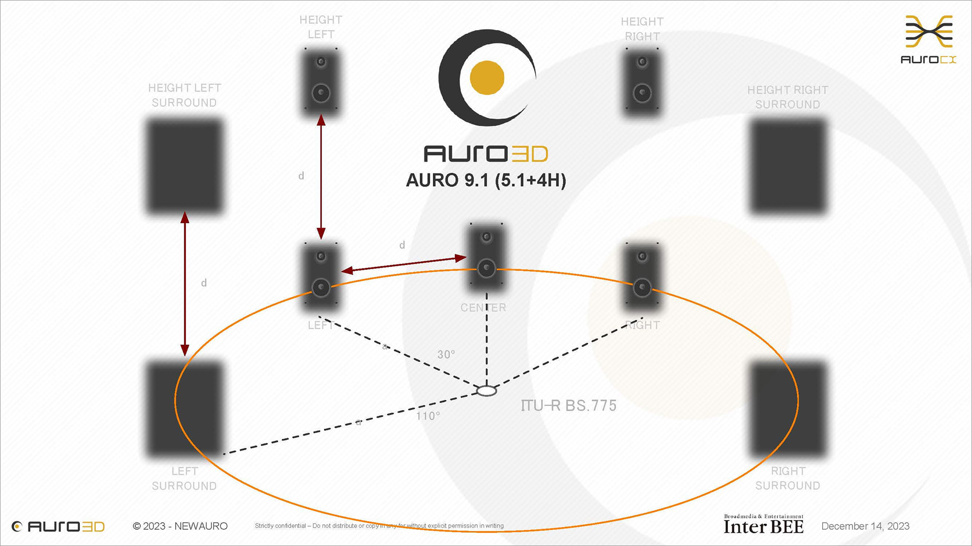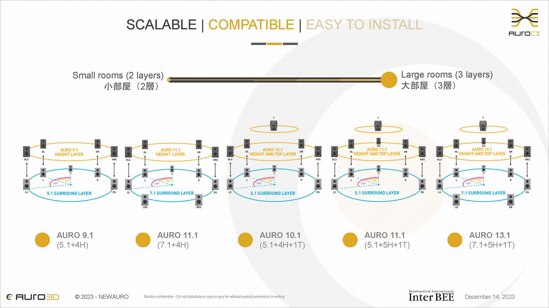 スピーカーの出力構造は部屋の広さによって2層構造、3層構造と変化します。特徴的なのはハイトにセンタースピーカー(AURO11.1ch以降)、最上部にトップスピーカーがあること(AURO10.1以降)。これによって上下のL-C-R(計6chのフロントスピーカー)で画面を囲むように配置され、より奥行き感のあるサウンドが得られます。