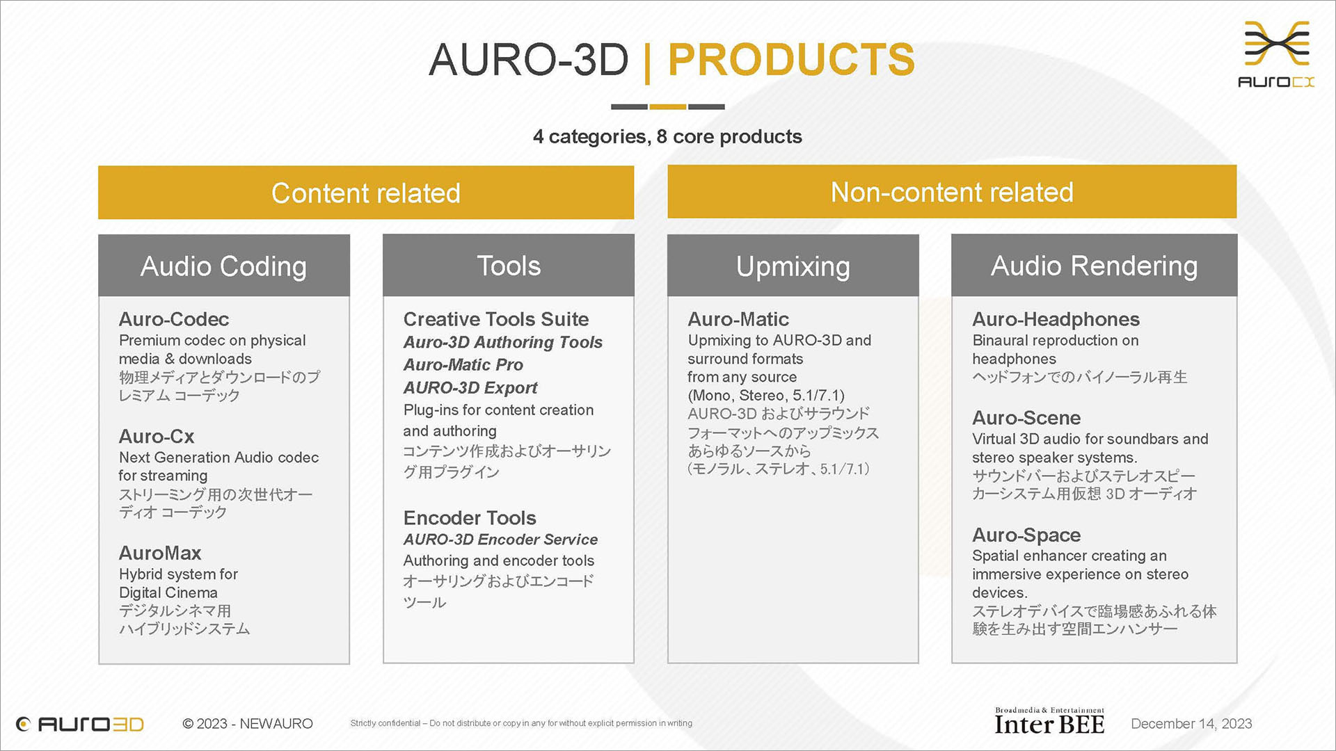 続いてAURO-3Dが提供するプロダクトの紹介がありました。これはコンテンツ制作に関連するものとしないものがあり、コンテンツ制作に関連するものはツールとオーディオ・コーディングで分かれ、前者はDAWと連携して使用するCreative Tools SuiteとEncoder Toolsが用意されます。後者はPCMのキャリアにしたプレミアムコーデックであるAuro-Codec、そして本セミナーの主役であるストリーミング用の次世代オーディオAuro-Cx、ストリーミングで映画を再生するためのAuro Maxがあります。またコンテンツ制作に関連しないものは、あらゆるソースをAURO-3D用にアップミックスするAuro-Matic、さらにオーディオレンタリングがヘッドフォンでのバイノーラルを再生するAuto-Headphones、そしてステレオもしくは5.1chなどで聞くための仮想3DオーディオAuro-Scene、Auto-Spaceと、計8種類をラインナップしています。