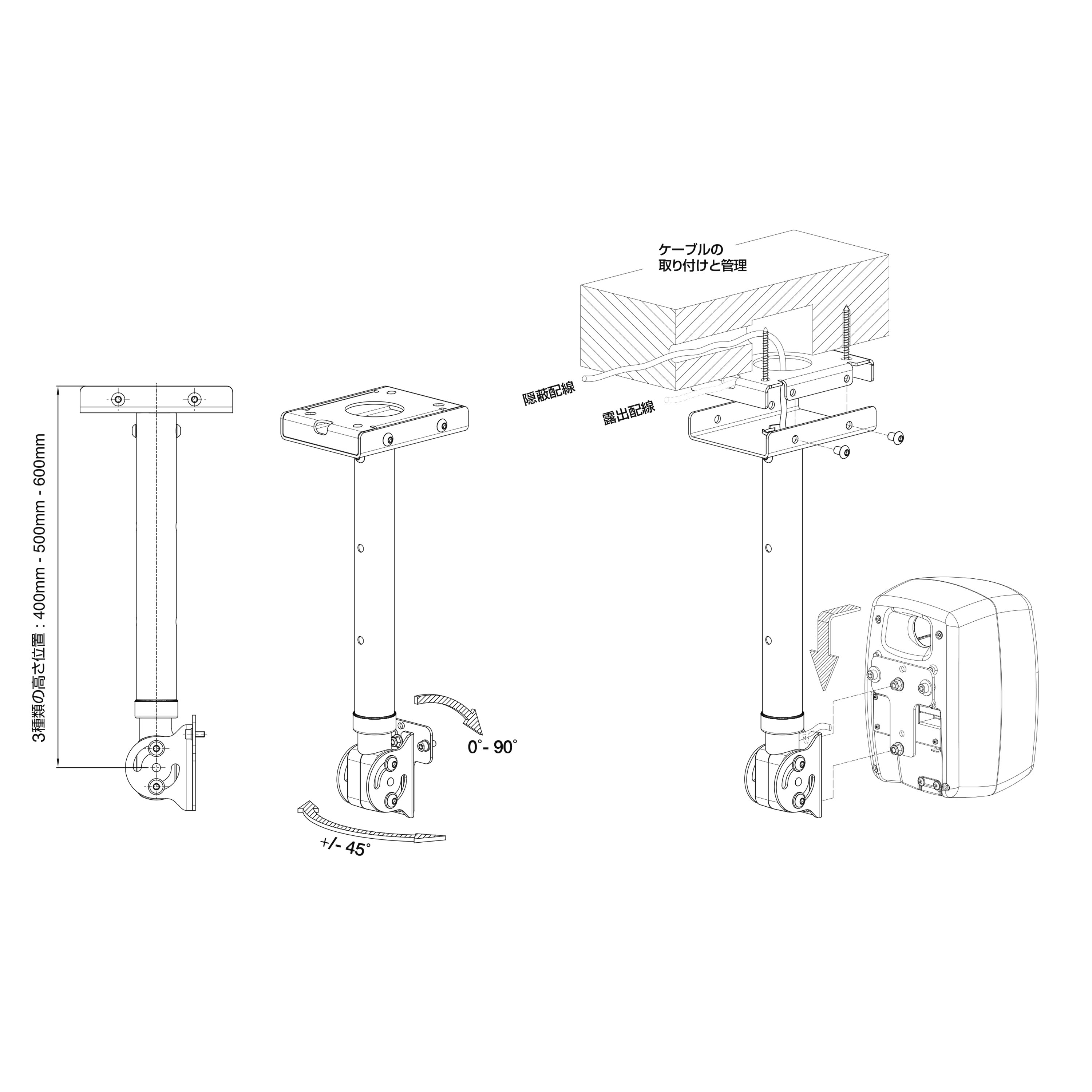 丈夫で信頼性の高いシーリング・マウントで、3種類の高さ位置(400 mm、500 mm、600 mm)を変更でき、90度まで下向きに傾斜させることができます。50 mmチューブにケーブルを通すことで、ケーブルを隠すことができます。ブラックおよびホワイト(パウダー・コート仕上げ)から選択できます。
