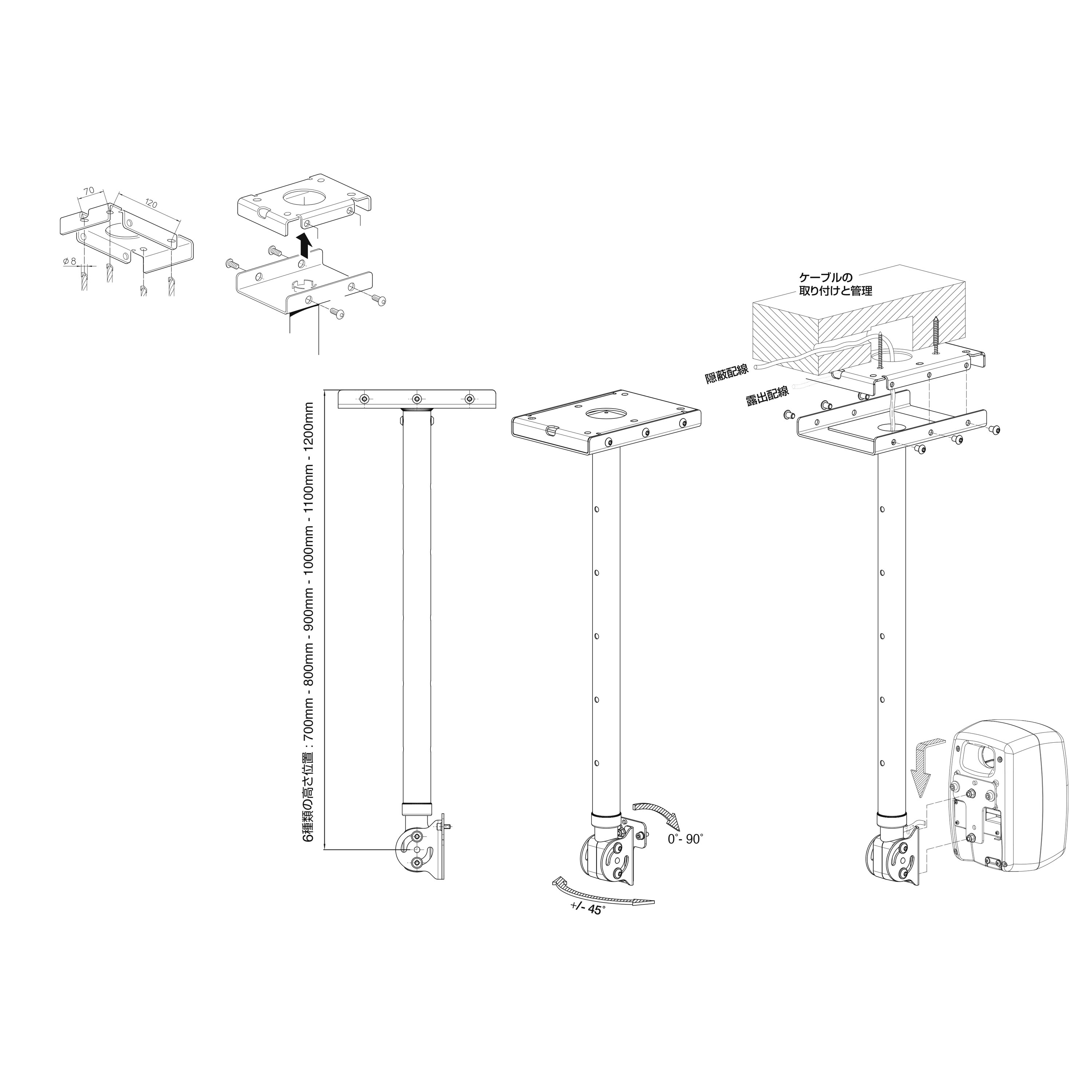 丈夫で信頼性の高いシーリング・マウントで、6種類の高さ位置(700 mm、800 mm、900 mm、1000 mm、1100 mm、1200 mm)を変更でき、90度まで下向きに傾斜させることができます。50 mmチューブにケーブルを通すことで、ケーブルを隠すことができます。ブラックおよびホワイト(パウダーコート仕上げ)から選択できます。