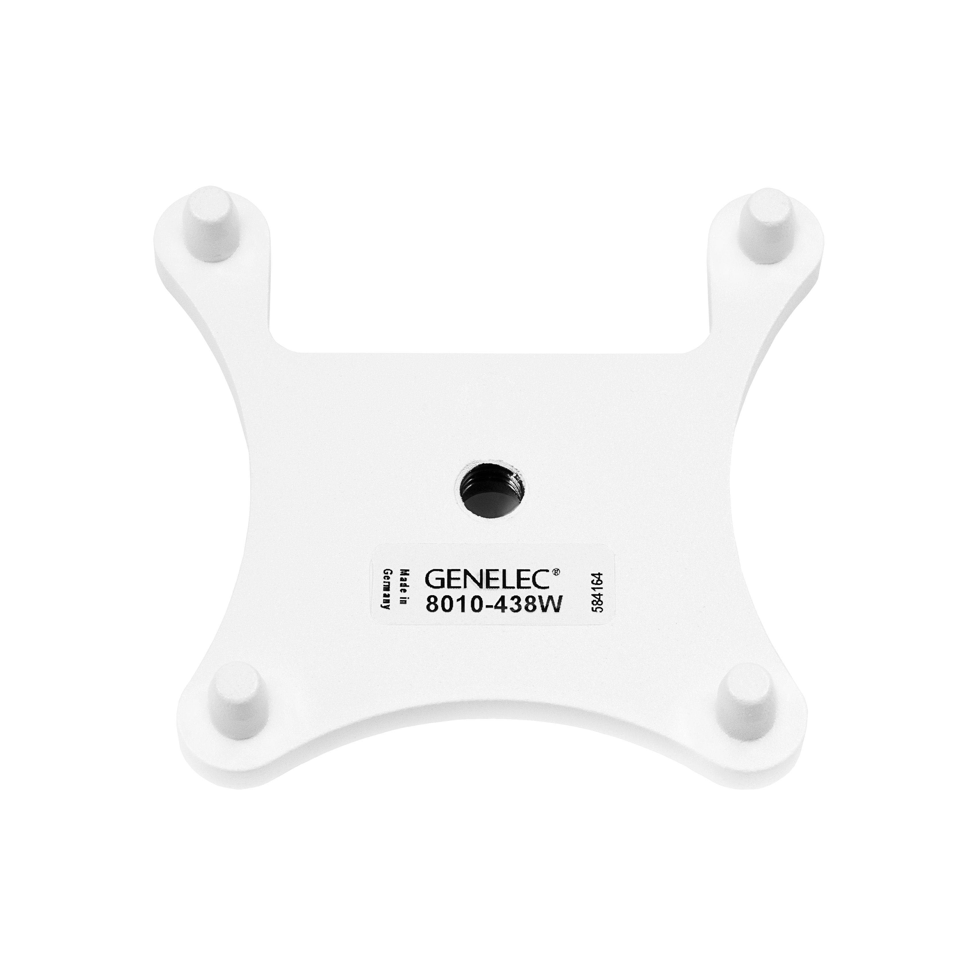 Genelecスタンド・プレートは、8000シリーズ全モニターに付属するIso-Podとの併用を前提にデザインされています。Iso-Podを使用すれば、モニターを最適な向きに傾けることができます。スタンド・プレートをパイプ先端の3/8" ネジに取り付けて固定します。Iso-Podをスタンド・プレートの4ピン上に配置すれば完了です。