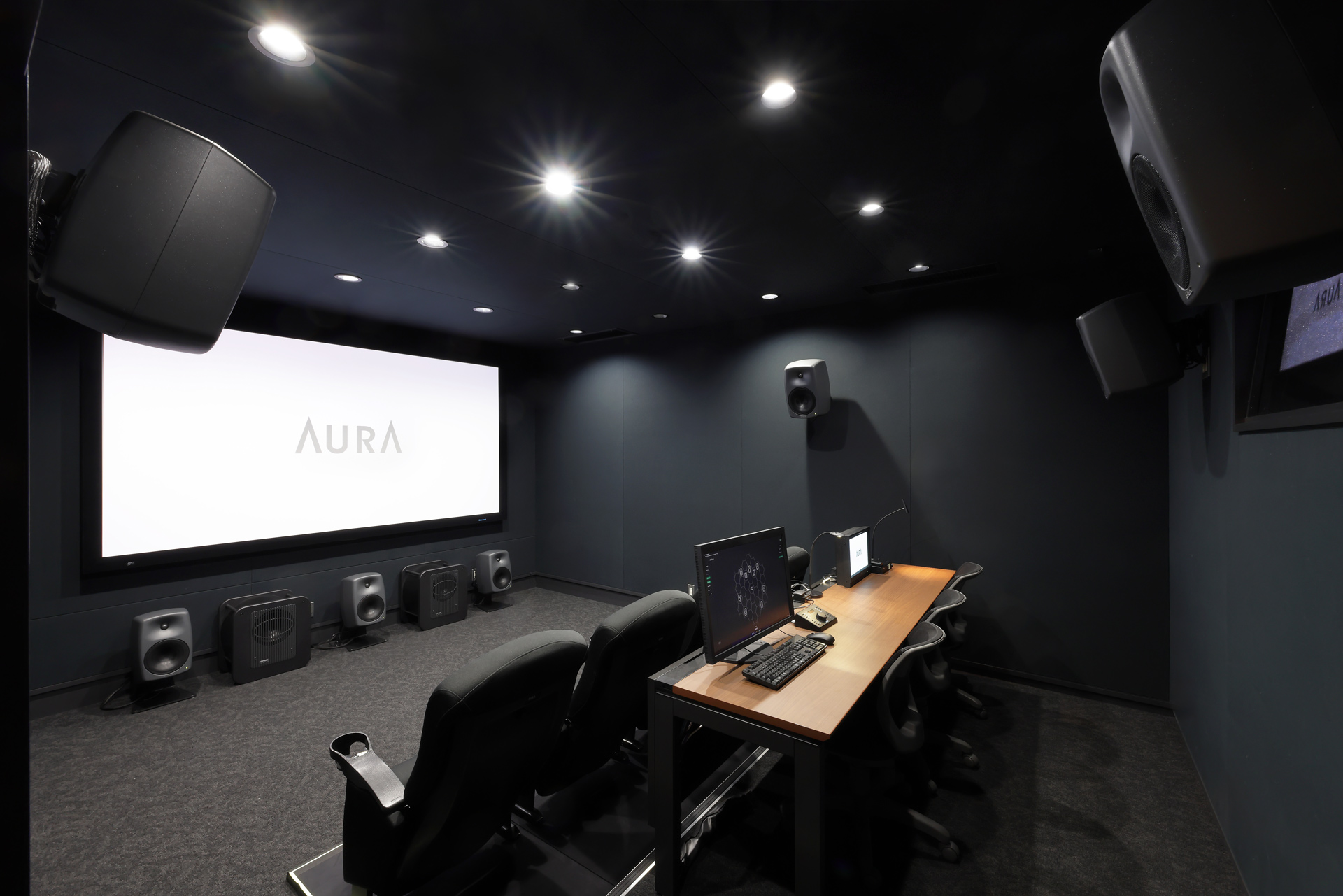 このプレビュールームで特徴的なのは、前方のスピーカーの配置です。字幕に関わるセリフやナレーションの聴き取りで重要となるセンターとL-Rはスクリーンの下に設置されています。通常の映画館では透過型スクリーンの後ろにスピーカーを配置しますが、AURAの場合は、正確な映像の確認ができるよう、画質を重視した非透過型のスクリーンを採用していることが関係します。AURAがこだわった機材選定と配置になっているのです。